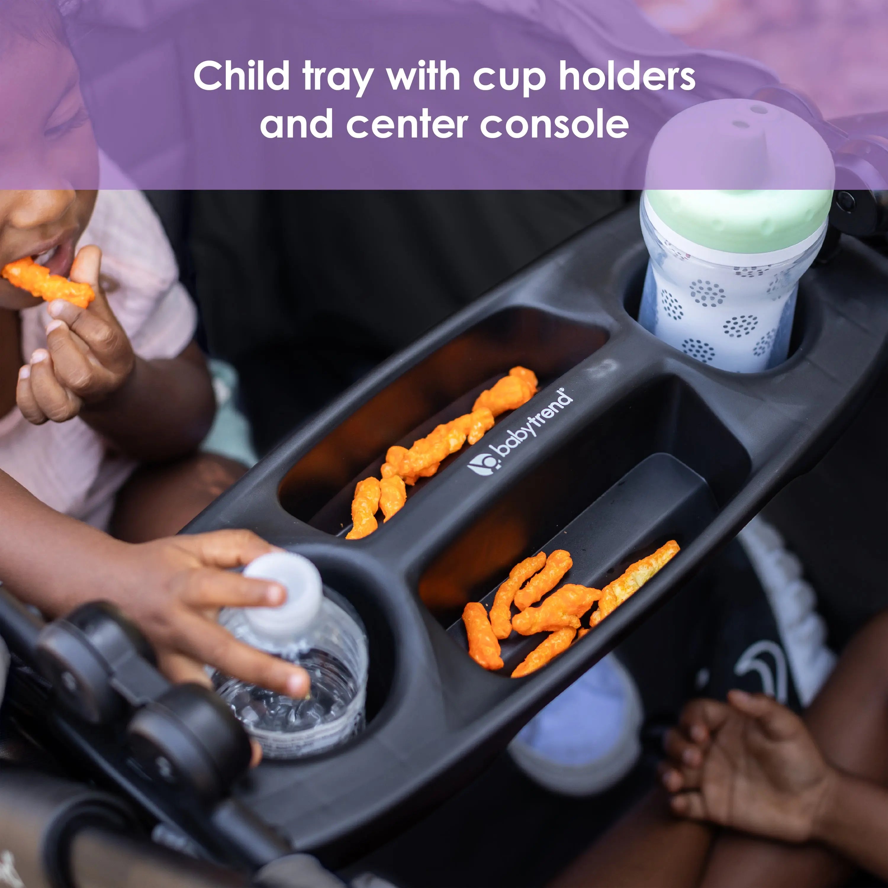 - Parent tray with two cupholders and a center console for convenient storage space.