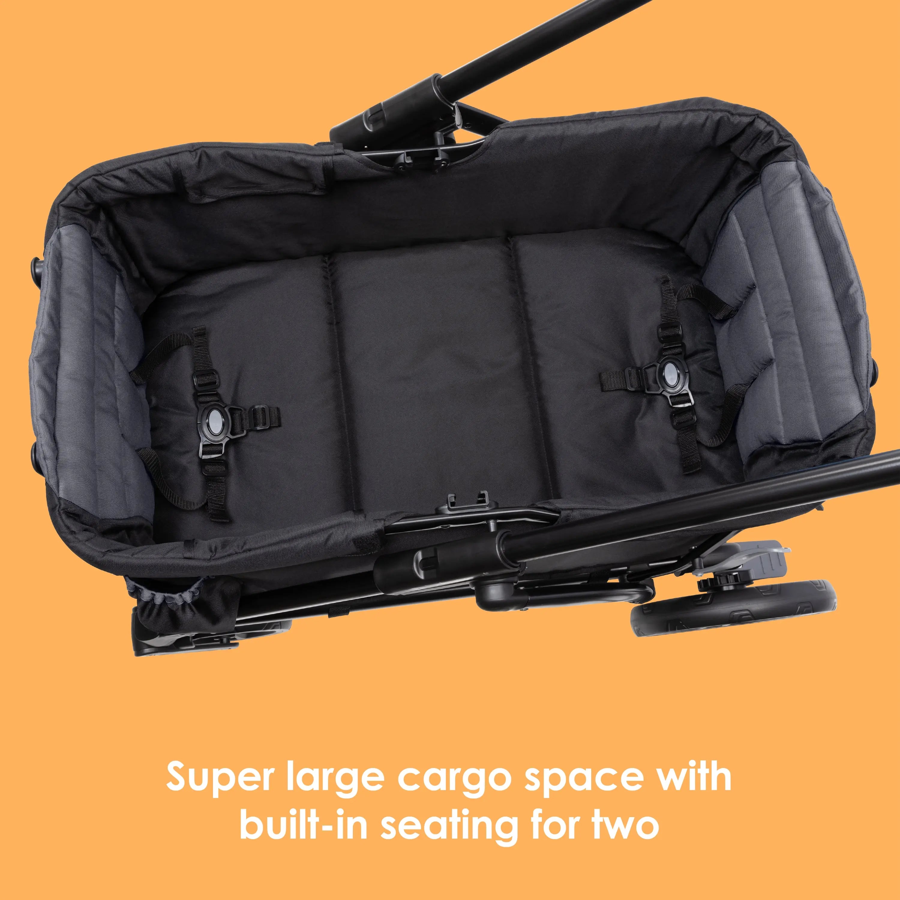 The wagon's hide-away pull handle is adjustable and offers a pull wagon option. The stroller handle can be used when in push stroller mode. The stroller handle also includes a parent tray with two cupholders and a center console for added storage. The child tray allows you to easily keep snacks close by with two cup holders and center consoles for each child. The 8" front and 11" rear wheels provides a smooth ride for your family whether spending time indoors our outside! This stroller wagon can hold up to 110 lb and is ideal for babies who can sit up unassisted, toddlers and young children.