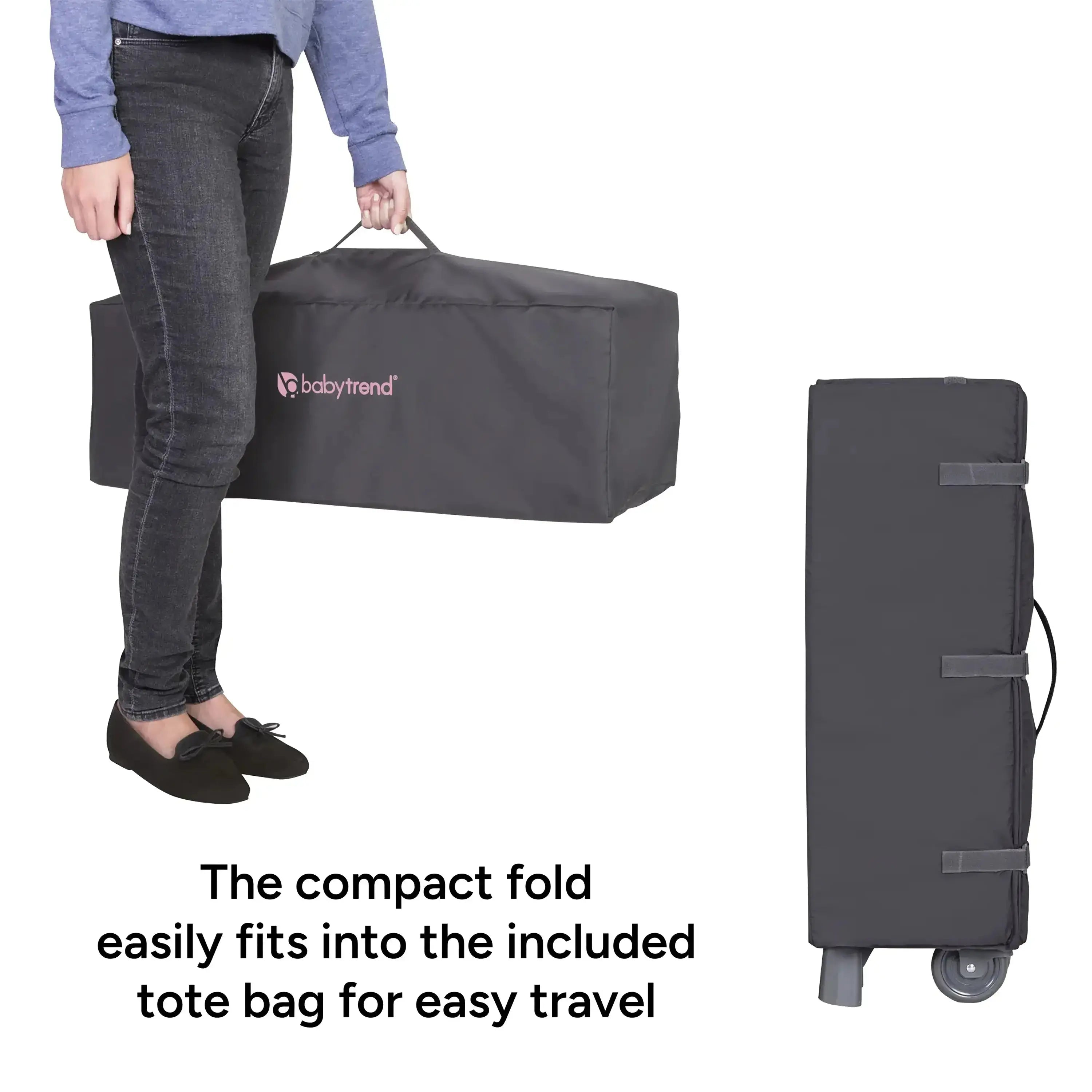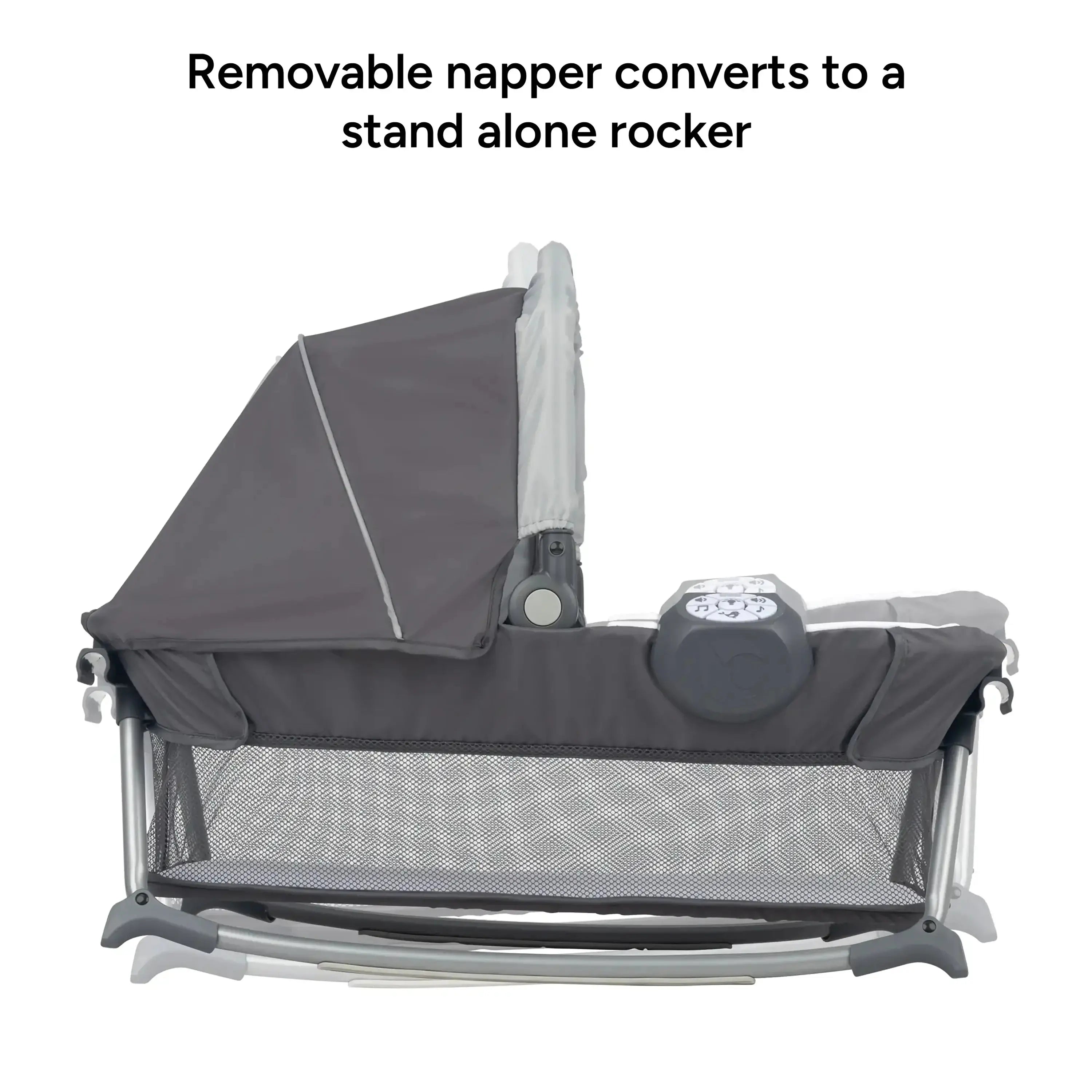 The Baby Trend® Simply Smart™ Nursery Center® features a Removable Rock-A-Bye Bassinet with a canopy and carry handle, plush fabric and mesh sides for proper ventilation, and 2 toys.